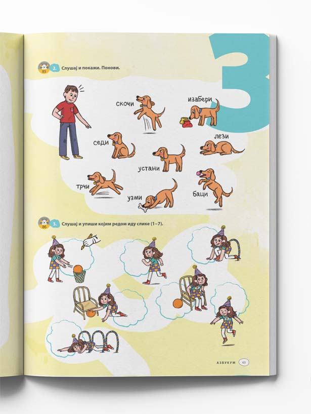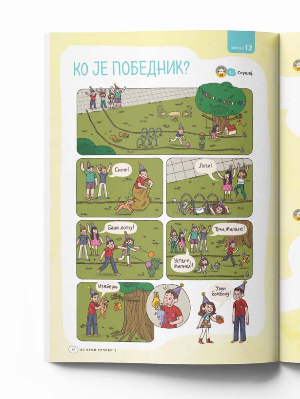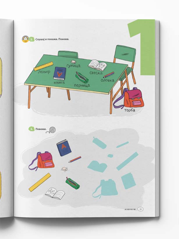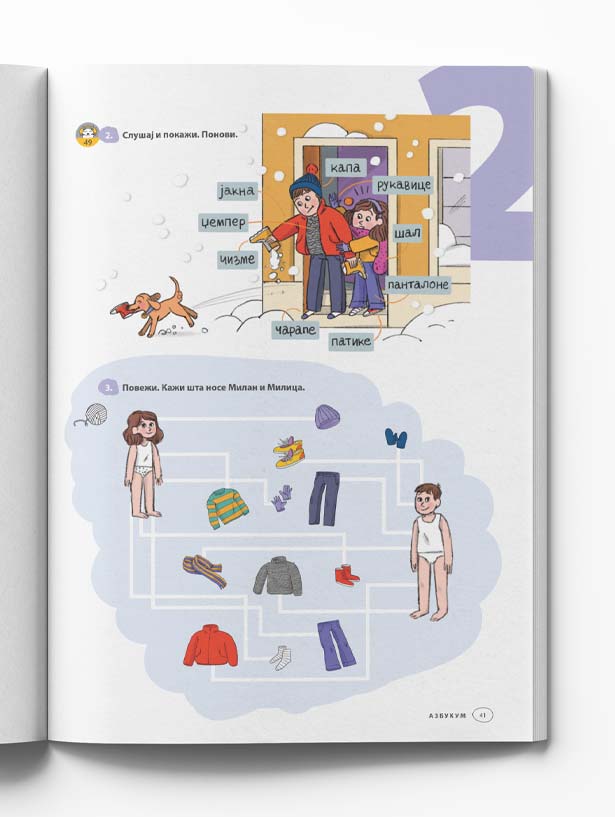 The first Azbukum Serbian study program for children aged 6-8. It consists of the textbook, a separate workbook, and audio recordings obtainable from the Azbukum site via a link inside the textbook.