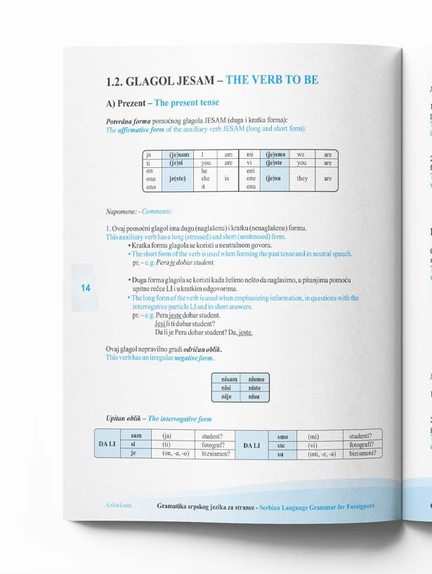 Kratka i razumljiva objašnjenja gramatičkih pravila data su paralelno na srpskom i engleskom jeziku, a sve je praćeno slikovitim primerima radi lakšeg usvajanja gradiva. Ova gramatika pokriva polja namenjena početnicima u učenju srpskog, ali i onima koji već imaju znanje srpskog (A2 i B1 nivoi).