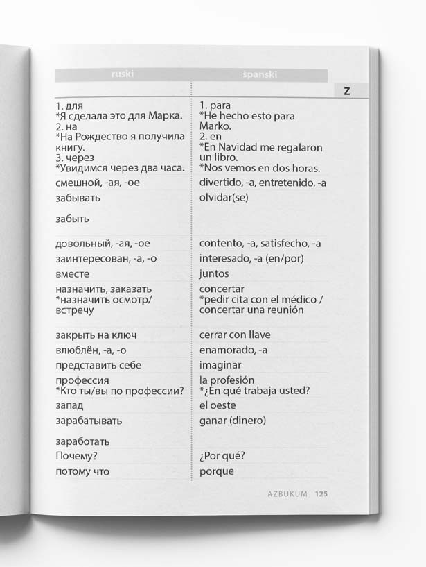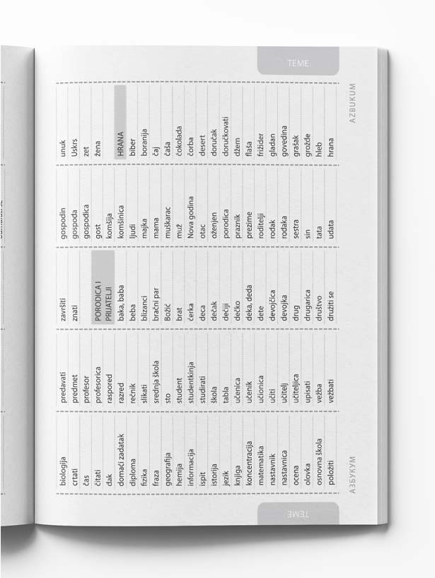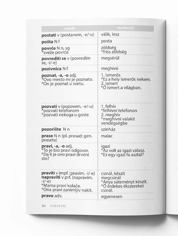 Rečnik najfrekventnijih reči i izraza prevedenih na šest jezika: engleski, nemački, ruski, francuski, mađarski i španski jezik. Uz indeks pojmova za lakše snalaženje, kao i spisak tema za pregledniji uvid, predstavlja odličan oslonac svima koji uče srpski na nivoima A1 i A2. Ovaj rečnik je izuzetan oslonac u radu predavačima jer nudi jasan pregled neophodnih reči i izraza koje njihovi polaznici treba da savladaju do prelaska na B1 nivo.
