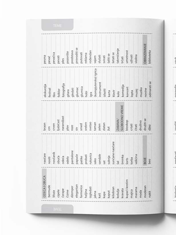 U sredini rečnika, između dva dela, nalazi se spisak pojmova po temama. Neke od tema su: odeća i obuća, hrana, obrazovanje, telo i zdravlje, slobodno vreme, porodica, kuća i sl. Ovaj spisak može biti koristan prilikom utvrđivanja leksike.