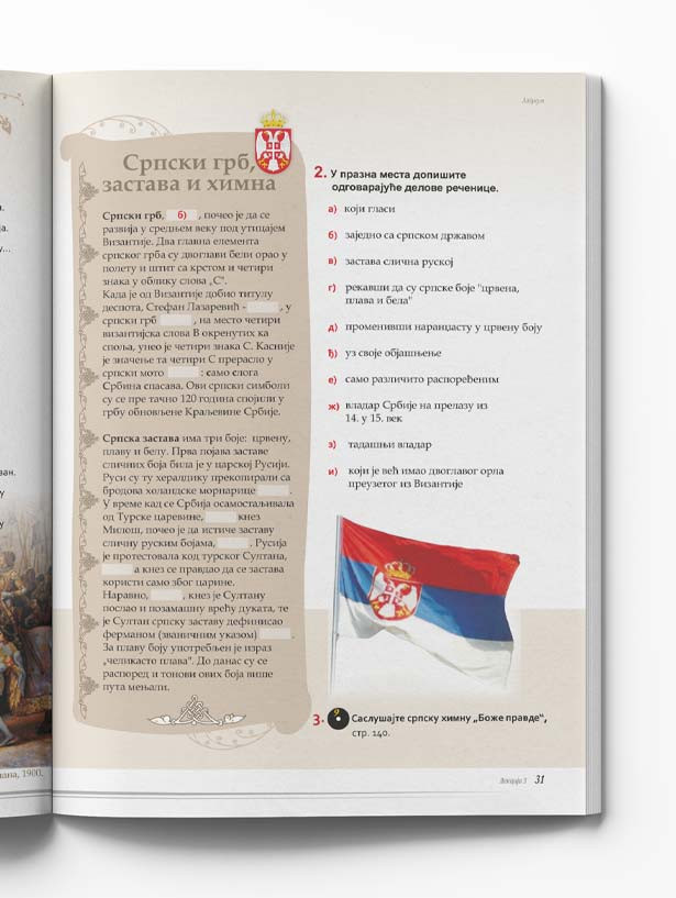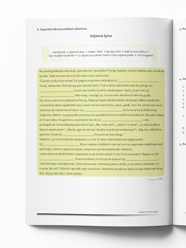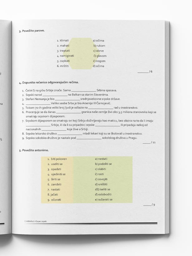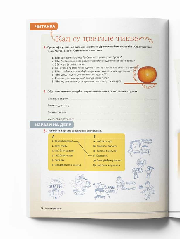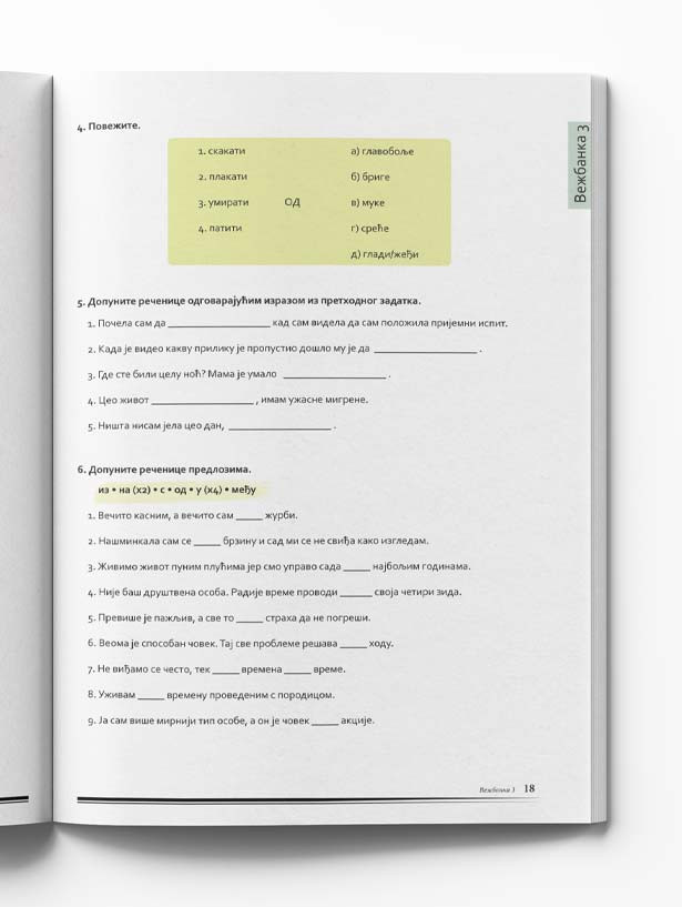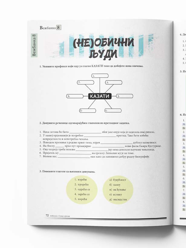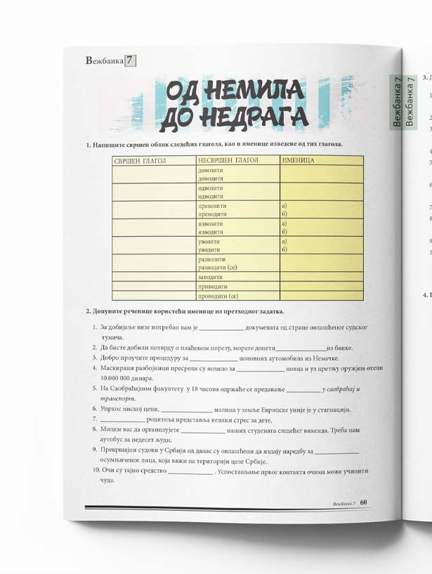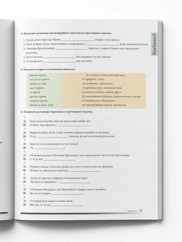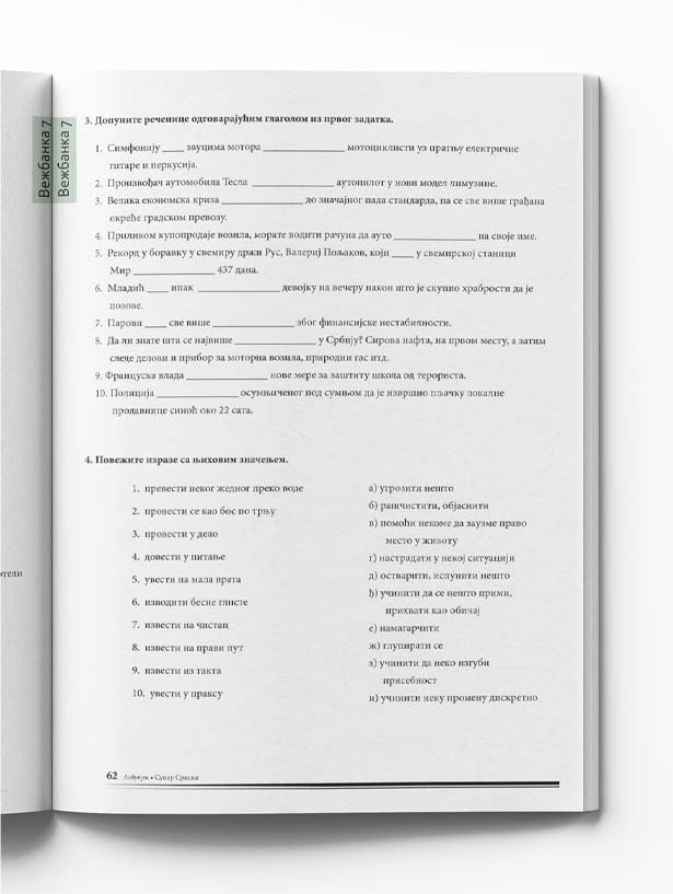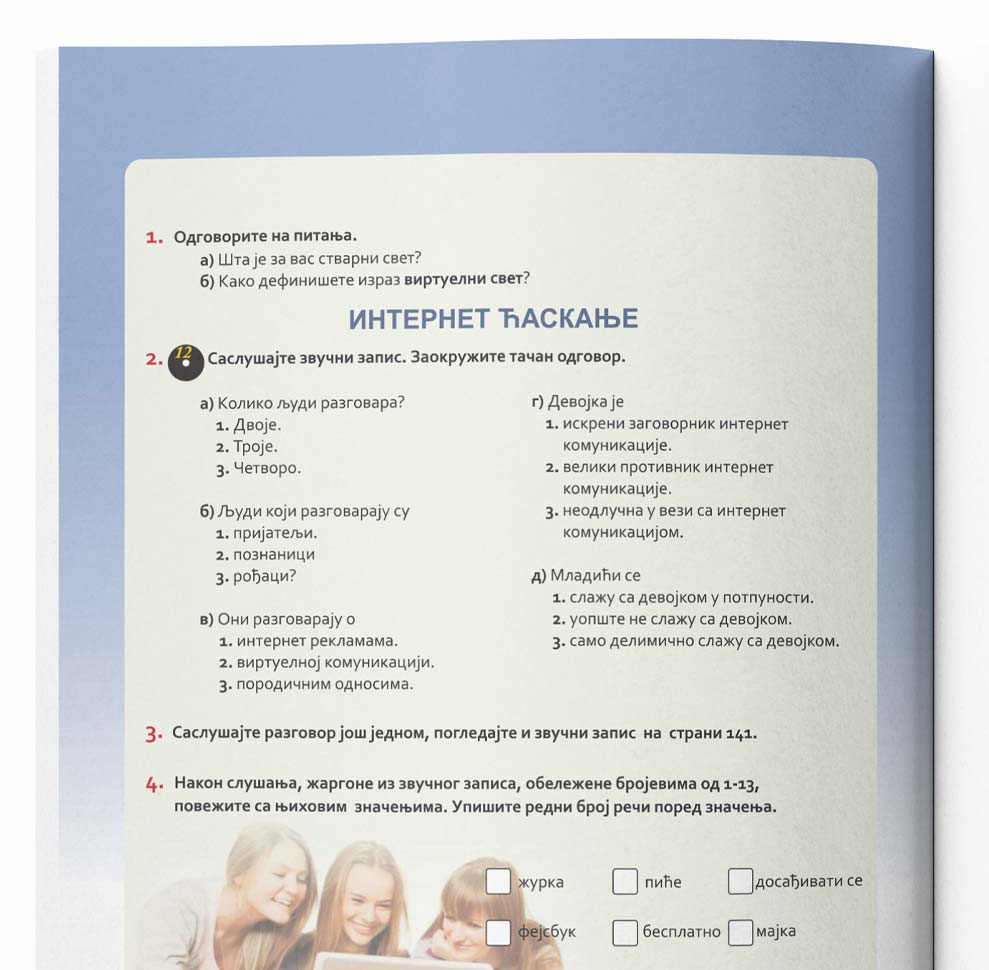 Udžbenik za visoke nivoe učenja srpskog (B2 i C1) koji prikazuje srpski u savremenom kontekstu kroz interesantne teme, korisne konverzacijske uzorke i primere različitih stilističkih modela. Vežbe čitanja, razumevanja, pismenog i usmenog izražavanja, te bogat izvor zvučnih zapisa i pregled gramatičkih pravila pomažu savladavanju zahtevnog viskog nivoa srpskog. Vežbanka (78 strana u pdf) sa revizornim testovima pruža mogućnost utvrđivanja gradiva i lakšeg praćenja napretka.