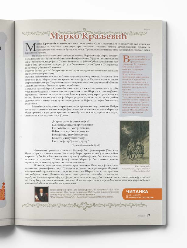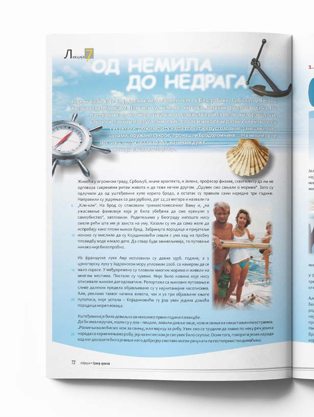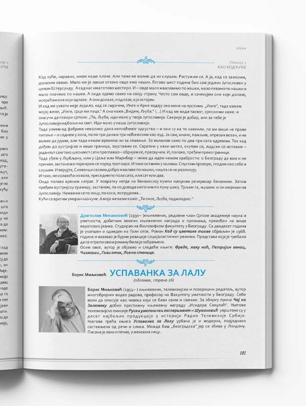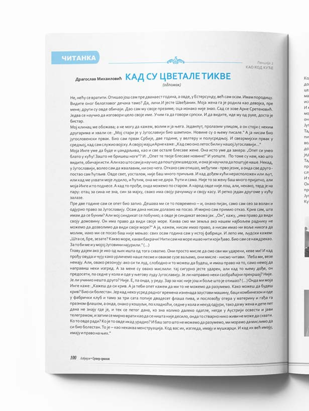 Svaku lekciju u zasebnom odeljku pod nazivom „Čitanka“ tematski prati odlomak iz savremene srpske književnosti u vidu pesama, kratkih priča ili odlomaka iz proznih dela, kao i različitih antropoloških ili putopisnih tekstova.