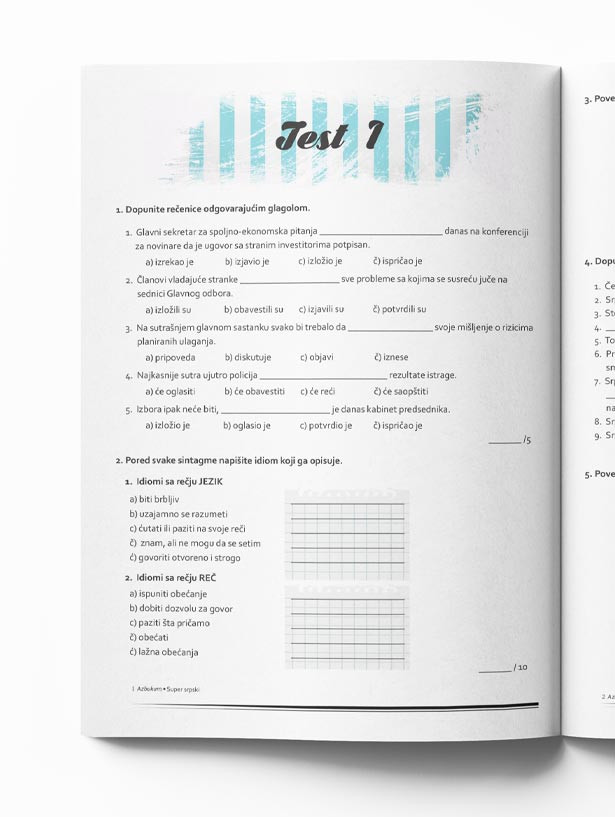Program „Super srpski“ osim udžbenika i dodatne Vežbanke ima i četiri revizorna testa planiranih da se rade nakon svake druge lekcije.